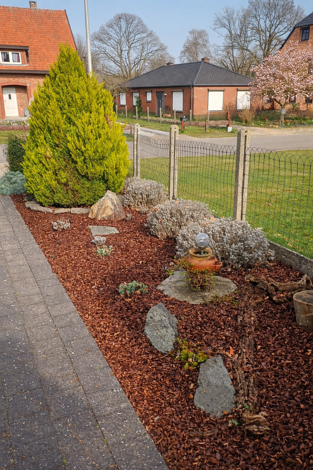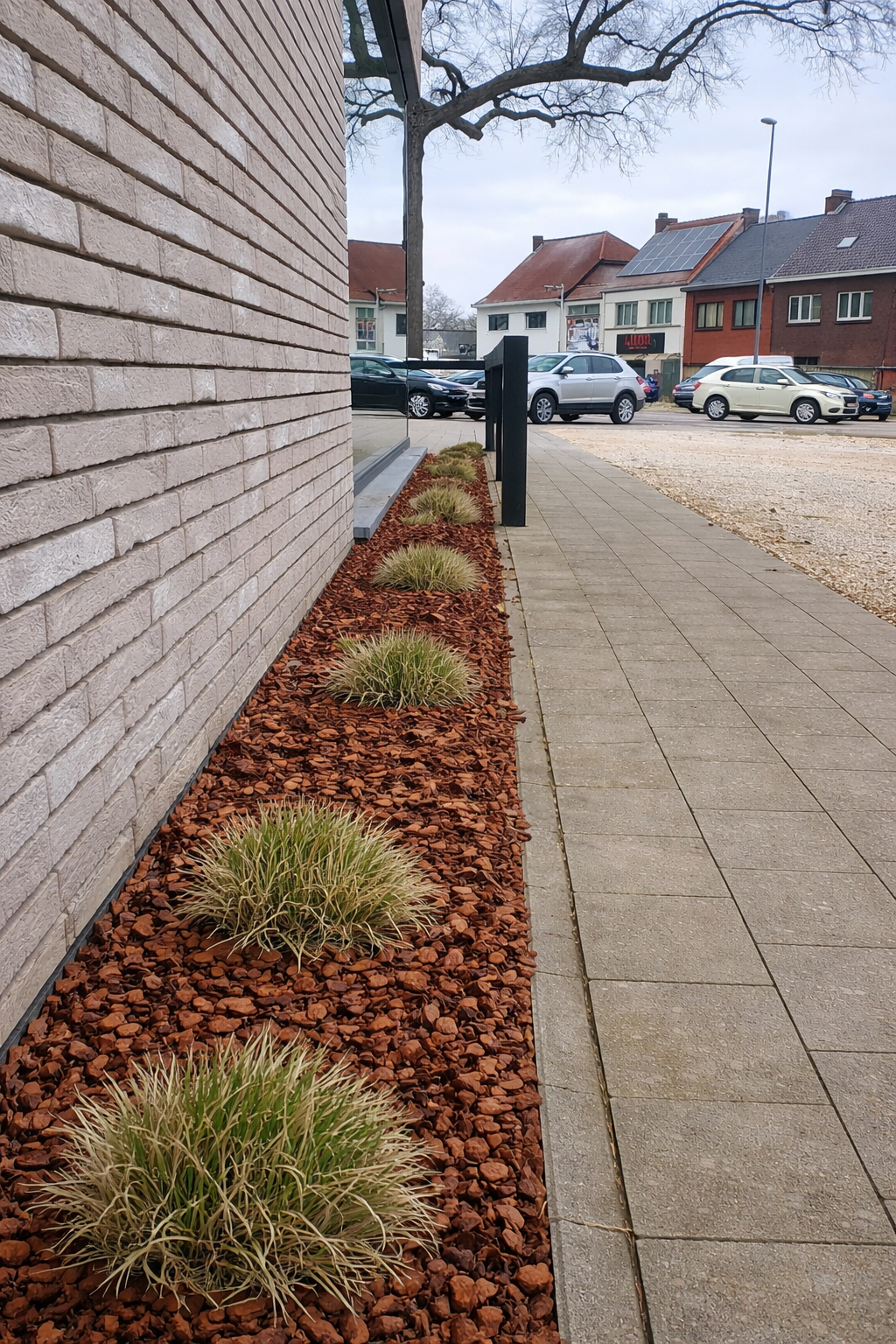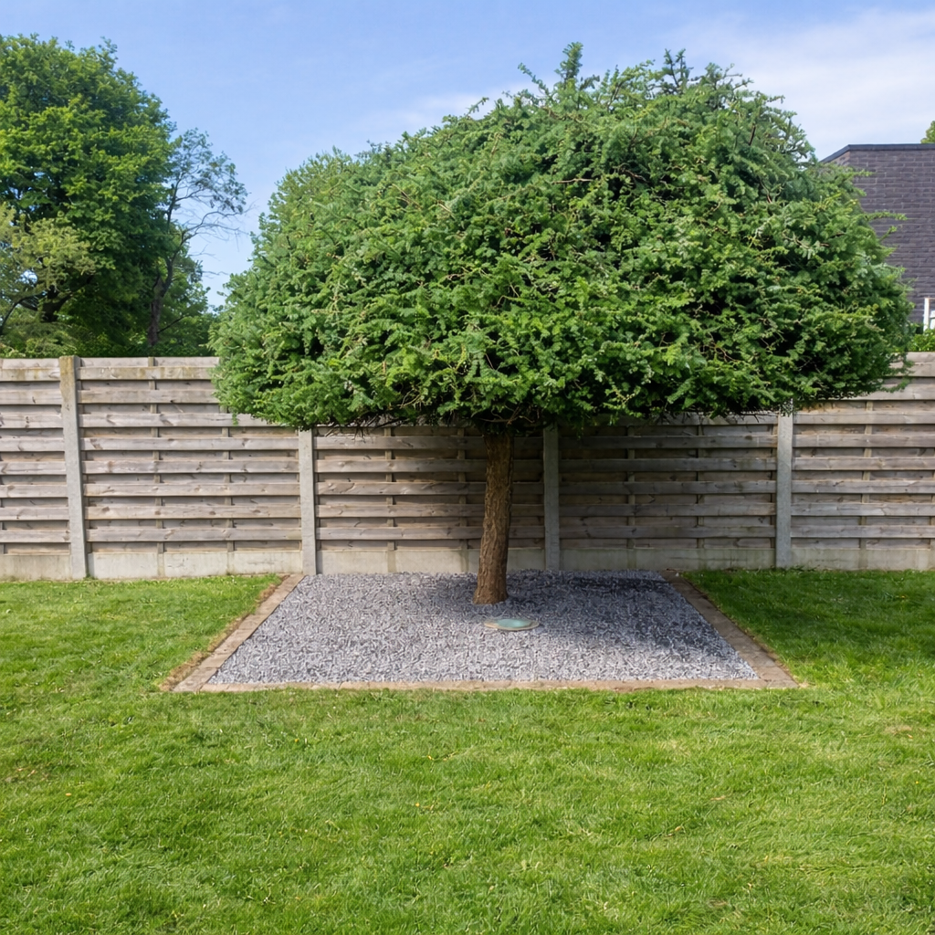 Aanleg van boomzone met grind en afboording.