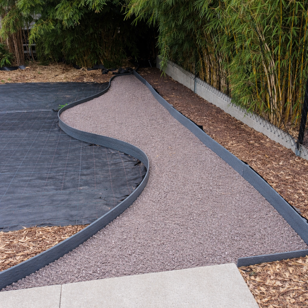 Aanleg van decoratief grindpad met duidelijke afboording.